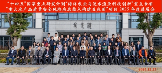 2025年12月27日,“十四五”国家重点研发计划“海洋农业与淡水渔业科技创新”重点专项“重大水产品质量安全风险应急技术构建及应用”项目2025年度进展会在浙江嘉善召开。本次会议由项目牵头单位上海海洋大学组织,浙江大学长三角智慧绿洲创新中心承办。农业农村部相关人员,项目咨询专家组全体专家,项目推荐单位代表,项目牵头单位、课题承担单位的领导与核心骨干等共计70余人出席会议,围绕项目年度执行情况展开深入研讨与交流。