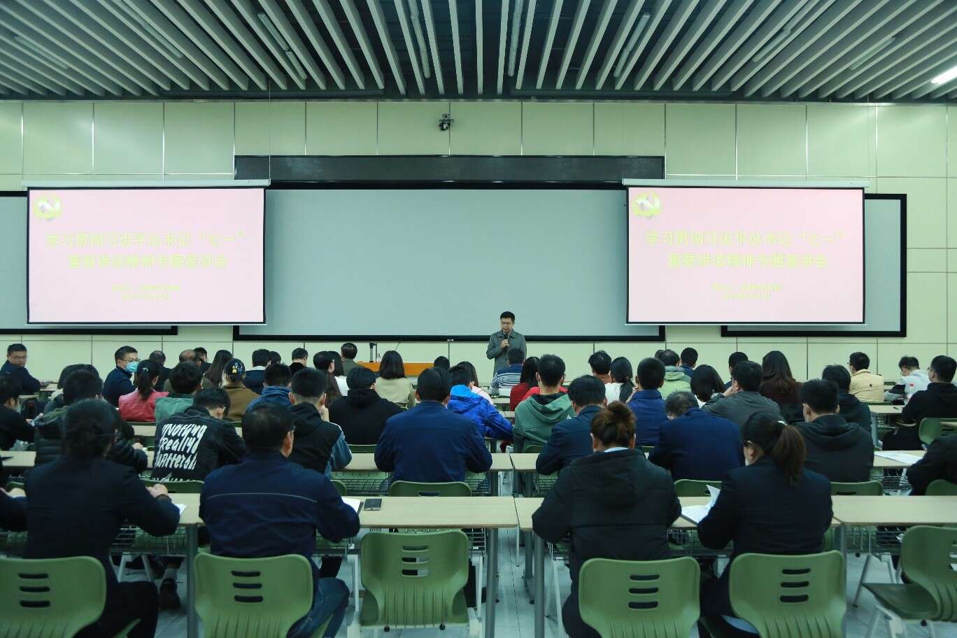 2021年10月27日下午,中国科学技术大学先进技术研究院在未来中心三号报告厅召开习近平总书记“七一”重要讲话精神宣讲会,校长助理,先研院党委书记、院长吴枫作题为《深入学习“七一”重要讲话精神 不忘初心 科教报国》宣讲报告。先研院全体员工、各支部党员以及师生代表共110余人参加会议。