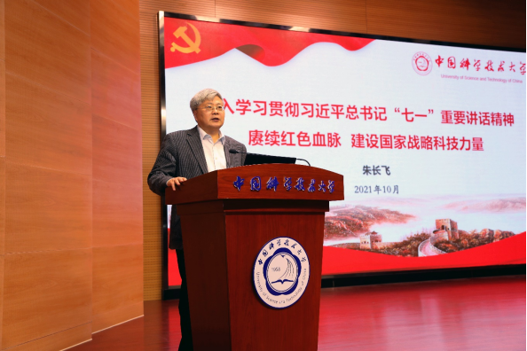 朱长飞带领大家回顾了校史。他强调,中国科大是我党为“两弹一星”事业而创办的一所大学,学校的诞生与发展是党领导高等教育取得伟大成就的一个缩影,学校的历史就是一部生动的科教报国史、创新奋斗史。朱长飞指出,进入新时代,党中央作出深入实施创新驱动发展战略部署,高度重视加强国家战略科技力量,国家实验室、高水平研究型大学都是国家战略科技力量的重要组成部分,要自觉履行高水平科技自立自强的使命担当。习近平总书记对高水平研究型大学、国家实验室的使命定位作出了明确指示,为学校的发展指明了方向。中国科大作为“国家队”“国家人”,必须心系“国家事”、肩扛“国家责”,牢记初心使命,赓续红色血脉,传承发扬“两弹一星”精神和老一辈科学家精神,秉承“红专并进、理实交融”的校训,弘扬“科教报国、追求卓越”的精神,努力办出中国特色、科大风格的世界一流大学,成为国家战略科技力量,为实现全面建成社会主义现代化强国的目标、为实现中华民族伟大复兴的中国梦,作出新的更大的贡献!