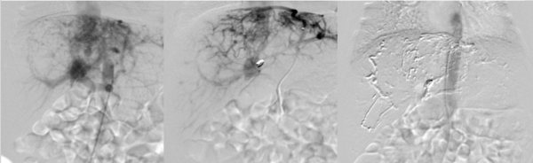 左图:腹主动脉造影显示肝内多发复杂动静脉瘘及动门脉瘘;中图:膈动脉造影膈动脉参与肝内复杂动静脉瘘;右图:术后造影显示肝内多发复杂动静脉畸形成功栓塞。